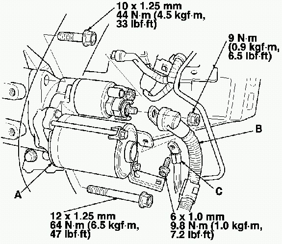 23. Install the starter motor (A), then connect the starter cable (B) and ground cable (C).
