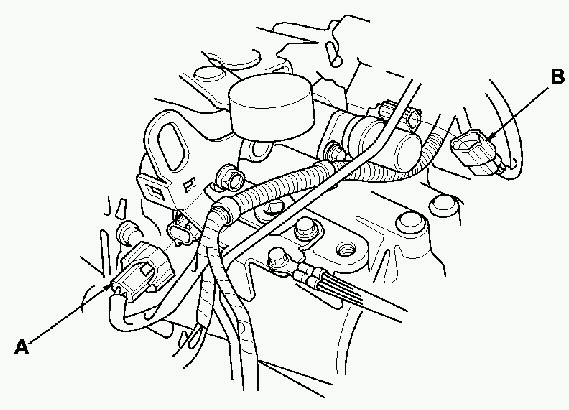26. Connect the back-up light switch connector (A) and reverse lockout solenoid (B).