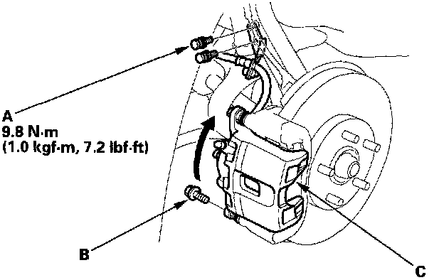 13. Pivot the caliper down into position. Being careful not to damage the pin boot, install the caliper bolt (B), and torque it to proper specification.