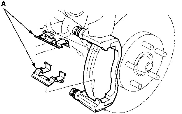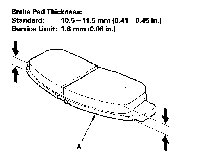 5. Using vernier calipers, measure the thickness of each brake pad lining. The measurement does not include pad backing plate (A) thickness.