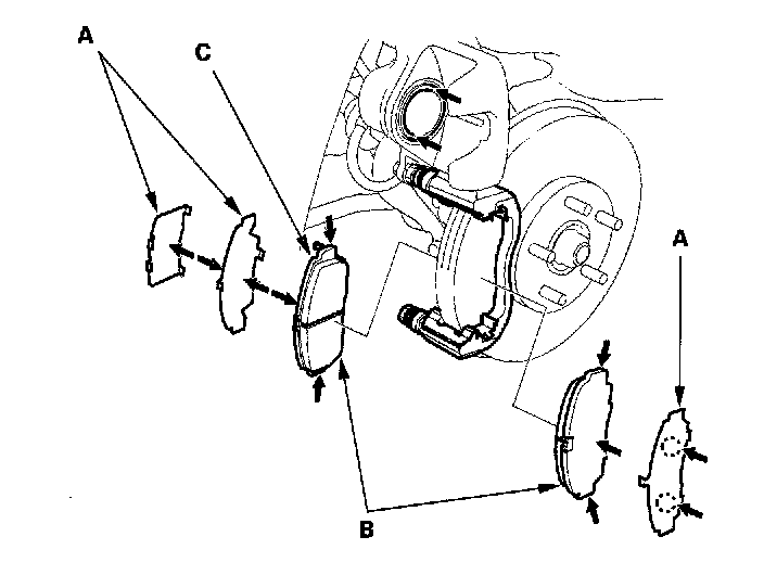 4. Remove the pad shims (A), pad retainers (B), and pads (C).