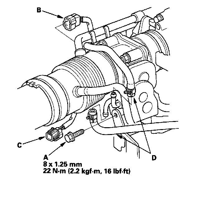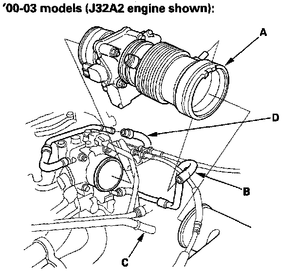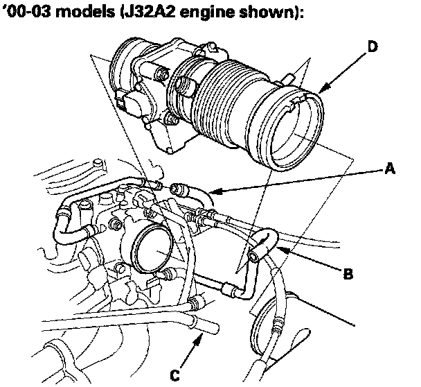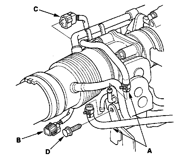 2. Remove the water bypass hoses (A). Disconnect the TCS control actuator connector (B) and the TCS control valve angle sensor connector (C) from the TCS control valve assembly, then remove the bolt (D) securing the TCS control valve bracket (J32A2 engine).