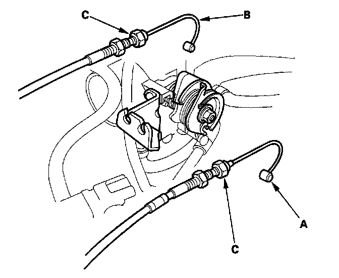 5. Remove the throttle cable (A) and cruise control cable (B) by loosening the locknuts (C), then slipping the cable ends out of the accelerator linkage. Take care not to bend the cables when removing them. Always replace any kinked cable with a new one.