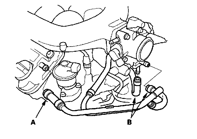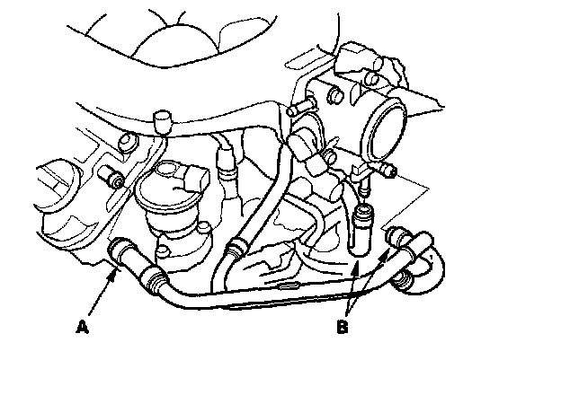 9. Remove the breather hose (A) and water bypass hoses (B).