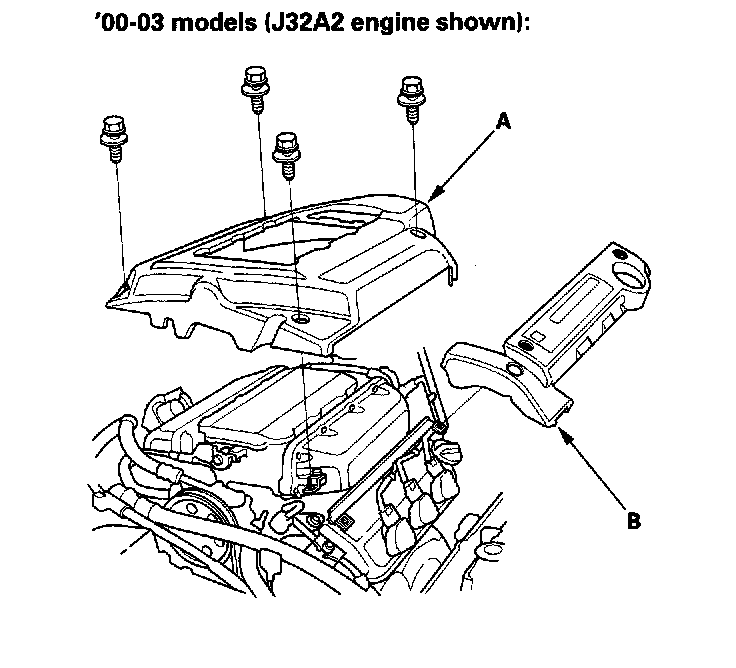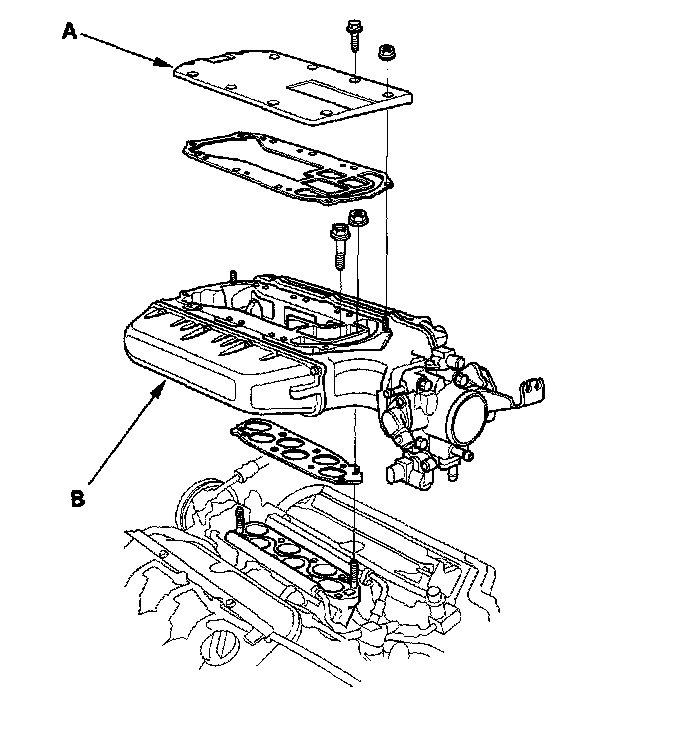 10. Remove the upper cover (A), then remove the intake manifold (B) ('00-03 models).