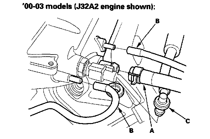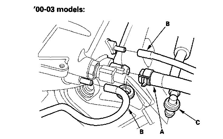 3. Install the brake booster vacuum hose (A), vacuum hoses (B) and positive crankcase ventilation (PCV) hose (C).