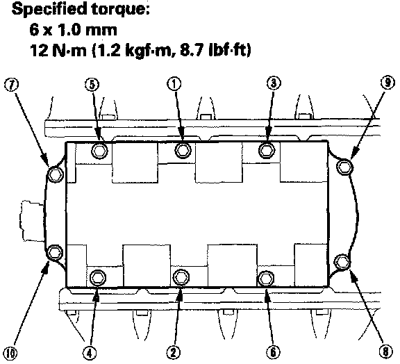 2. Install the upper cover. Tighten the bolts and nuts sequentially two or three steps. Always use a new gasket ('00-03 models).