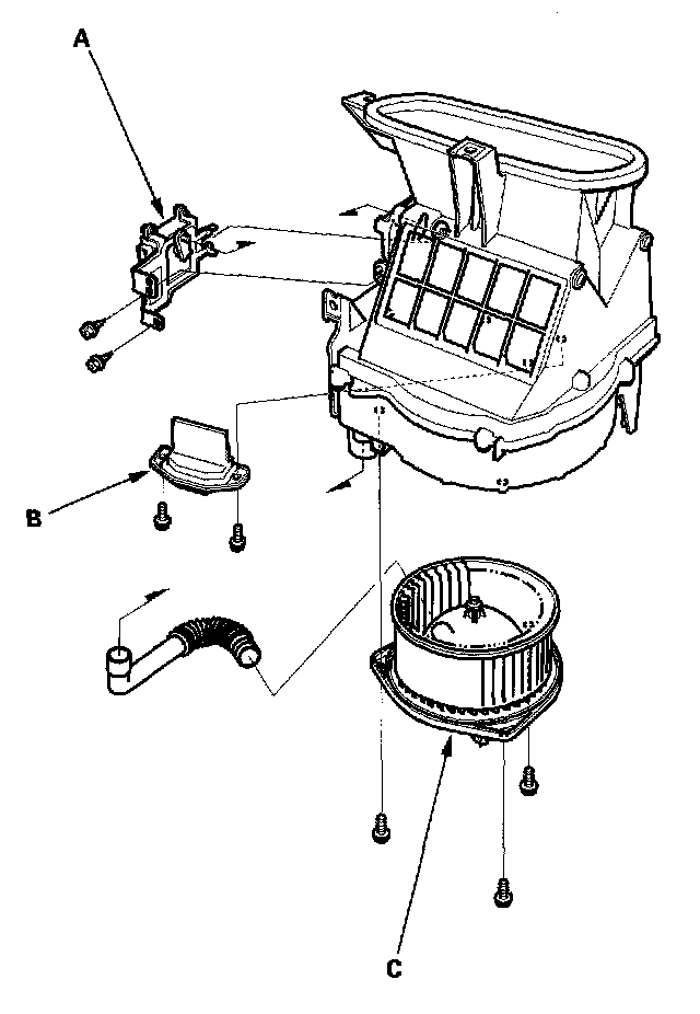 - The recirculation control motor (A), the power transistor (B) and the blower motor (C) can be replaced without removing the blower unit.