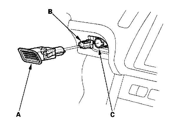 In-car Temperature Sensor Replacement1. Remove the in-car temperature sensor (A) from the dashboard, then disconnect the 2P connector (B) and the air hose (C). Be careful not to damage the sensor or the dashboard.