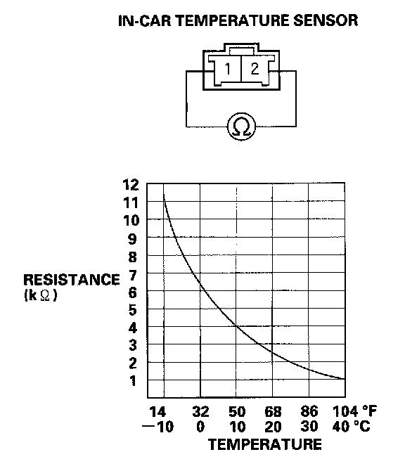 Compare the resistance reading between the No. 1 and No. 2 terminals of the in-car temperature sensor with the specifications shown in the graph; the resistance should be within the specifications.