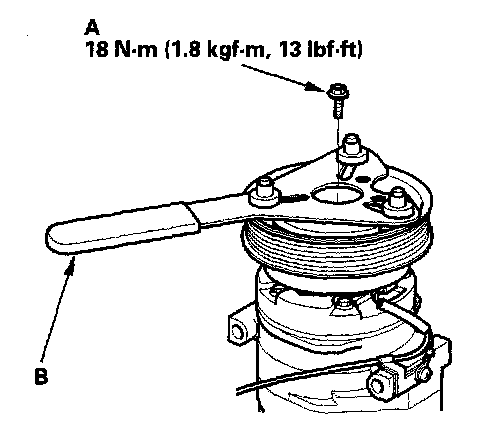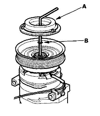 1. Remove the center bolt (A) while holding the pressure plate with a commercially available A/C clutch holder (B).