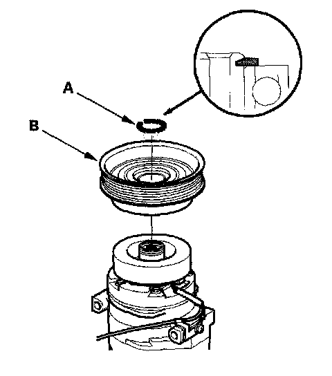3. If you are replacing the field coil, remove the snap ring (A) with snap ring pliers, then remove the pulley (B). Be careful not to damage the pulley or the compressor.