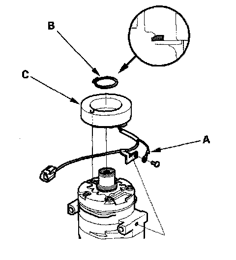 4. Remove the screw from the field coil ground terminal (A). Remove the snap ring (B) with snap ring pliers, then remove the field coil (C). Be careful not to damage the field coil or the compressor.