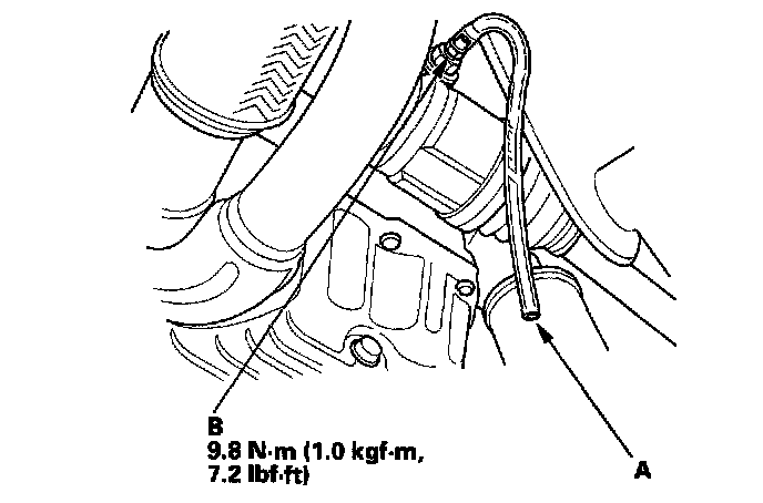 4. Install a rubber hose (A) on the drain bolt (B) located at the rear of the cylinder block, then loosen the drain bolt.
