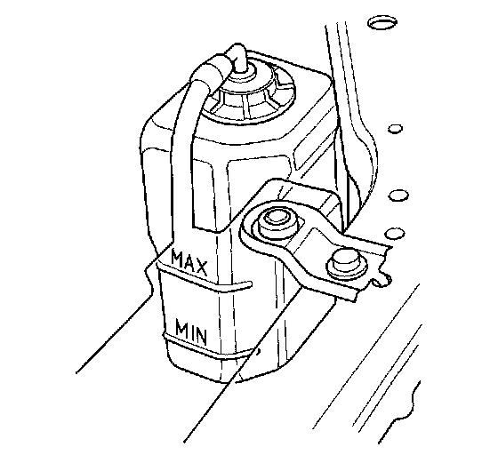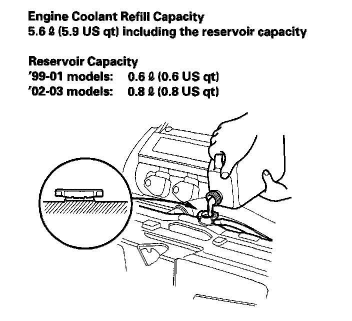 7. Remove, drain, and reinstall the reservoir. Fill the tank to the MAX mark with Honda All Season Antifreeze/Coolant Type 2.