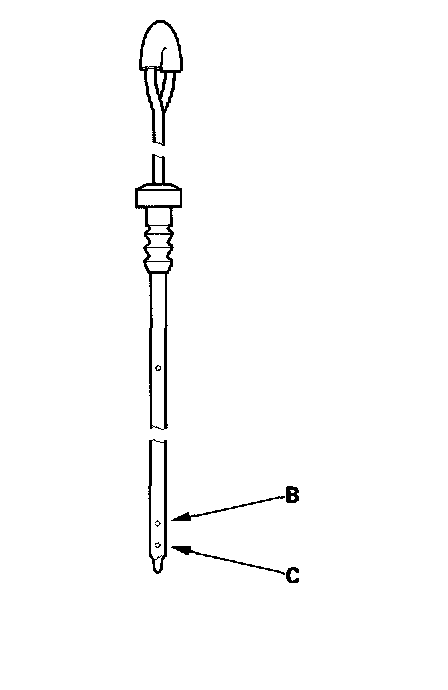 5. Remove the dipstick and check the fluid level. It should be between the upper mark (B) and lower mark (C).