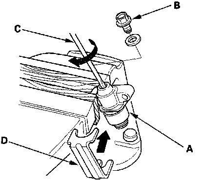 8. Insert a flat blade screwdriver (C) into the maintenance hole. Place the retainer (D) (P/N 14540-P8A-A01) on the auto-tensioner while turning the screwdriver clockwise to compress the bottom ('99 model).