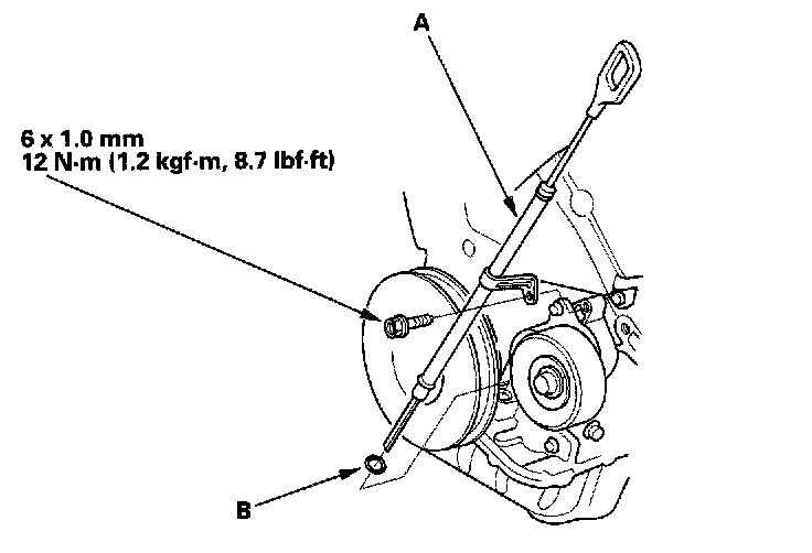 6. Hold the auto-tensioner (A) with the maintenance bolt pointing up. Loosen and remove the maintenance bolt (B) ('99 model).