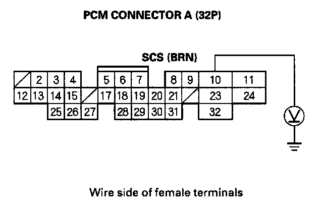 26. Measure voltage between PCM connector terminal A10 and body ground.