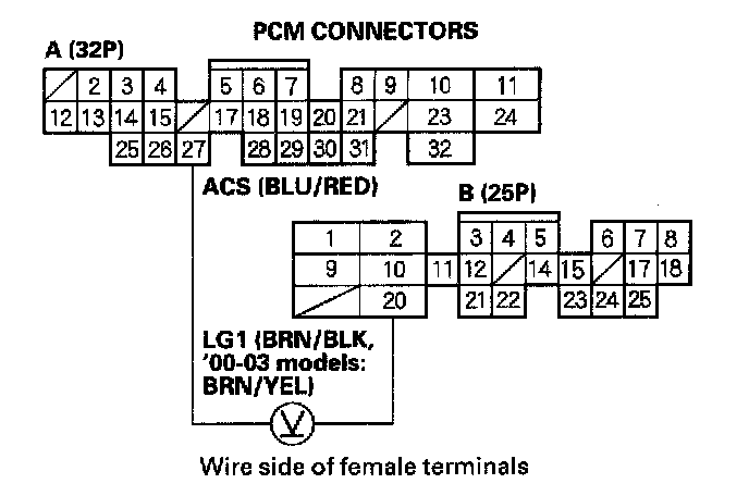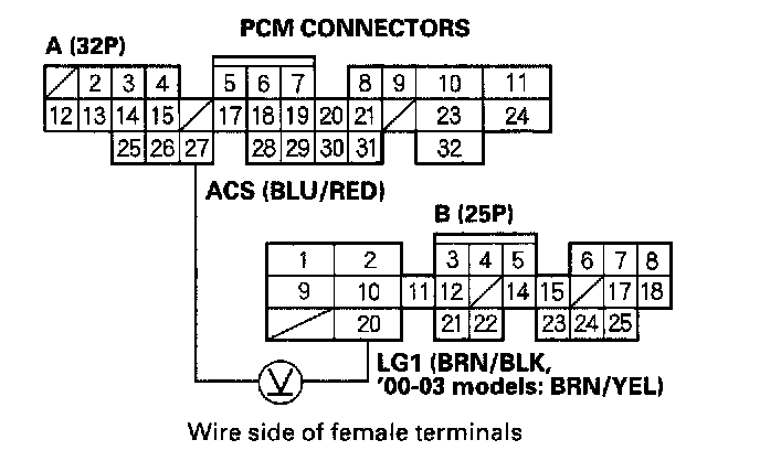 4. Measure voltage between PCM connector terminals A27 and B20.