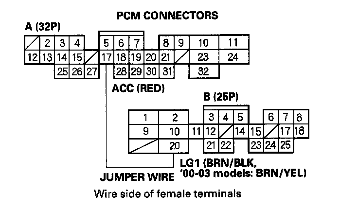 8. Momentarily connect PCM connector terminals A17 and B20 with a jumper wire several times.