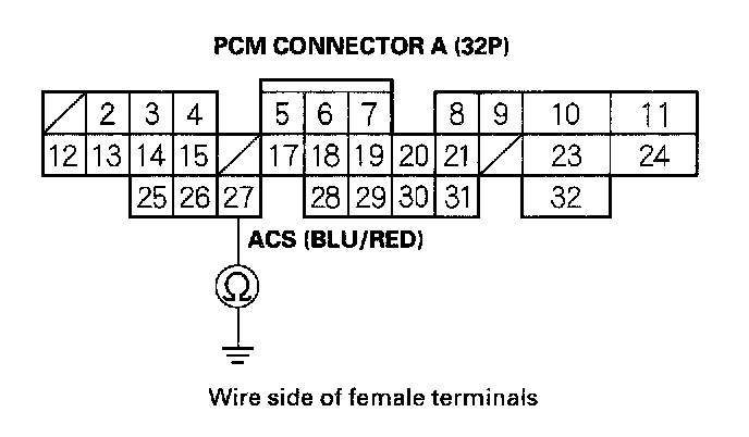 14. Check for continuity between body ground and PCM connector terminal A27.