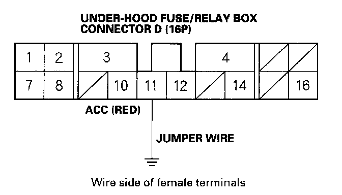15. Momentarily connect under-hood fuse/relay box 16P connector terminal No.11 to body ground with a jumper wire several times.