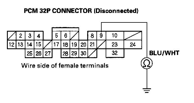 6. Connect the No.9 terminal of the 32P PCM connector to the positive probe of a voltmeter, and connect the negative probe to body ground.
