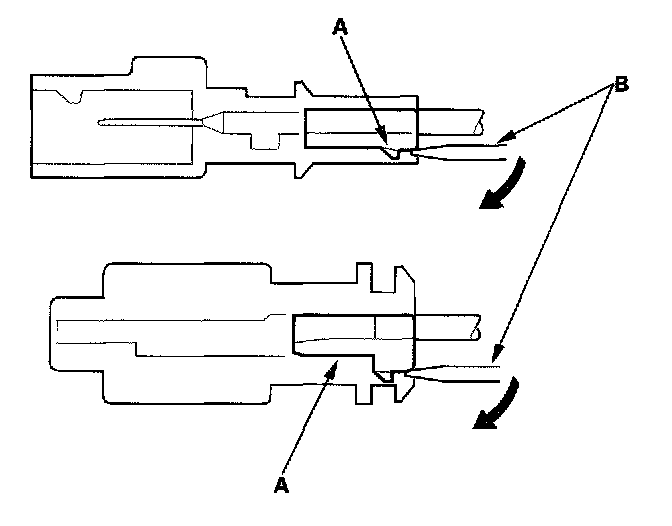 Backprobing Spring-loaded Lock ConnectorsWhen checking voltage or resistance on this type of connector the first time, you must remove the retainer to insert the tester probe from the wire side.