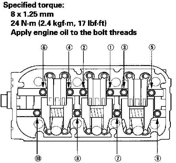 Tighten each bolt two turns at a time in the sequence shown to ensure that the rockers do not bind on the valves.