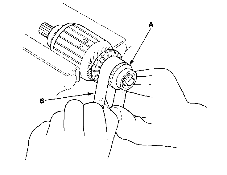 4. Check the commutator (A) surface. If the surface is dirty or burnt, resurface with emery cloth or a lathe within the following specifications, or recondition with # 500 or # 600 sandpaper (B).