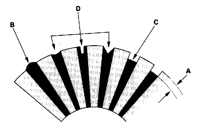 7. Check the mica depth (A). If the mica is too high (B), undercut the mica with a hacksaw blade to the proper depth. Cut away all the mica (C) between the commutator segments. The undercut should not be too shallow, too narrow, or V-shaped (D).