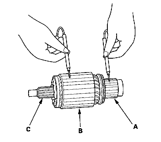10. Check with an ohmmeter that no continuity exists between the commutator (A) and armature coil core (B), and between the commutator and armature shaft (C). If continuity exists, replace the armature.