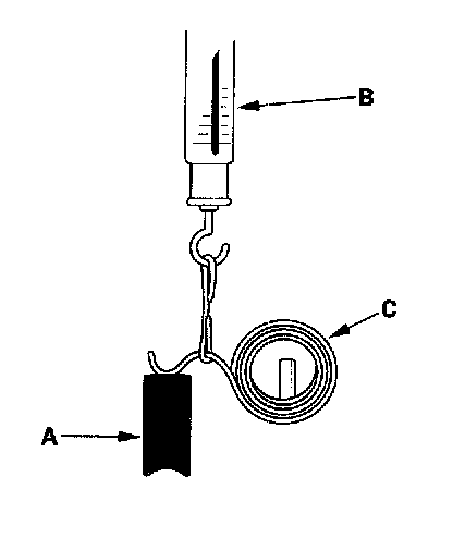 13. Insert the brush (A) into the brush holder, and bring the brush into contact with the commutator, then attach a spring scale (B) to the spring (C). Measure the spring tension at the moment the spring lifts off the brush. If the spring tension is not within specification, replace the spring.