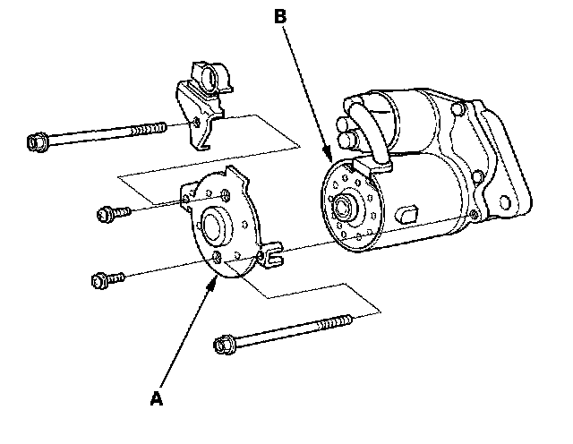 16. Install the starter end cover (A) to retain the brush holder (B).