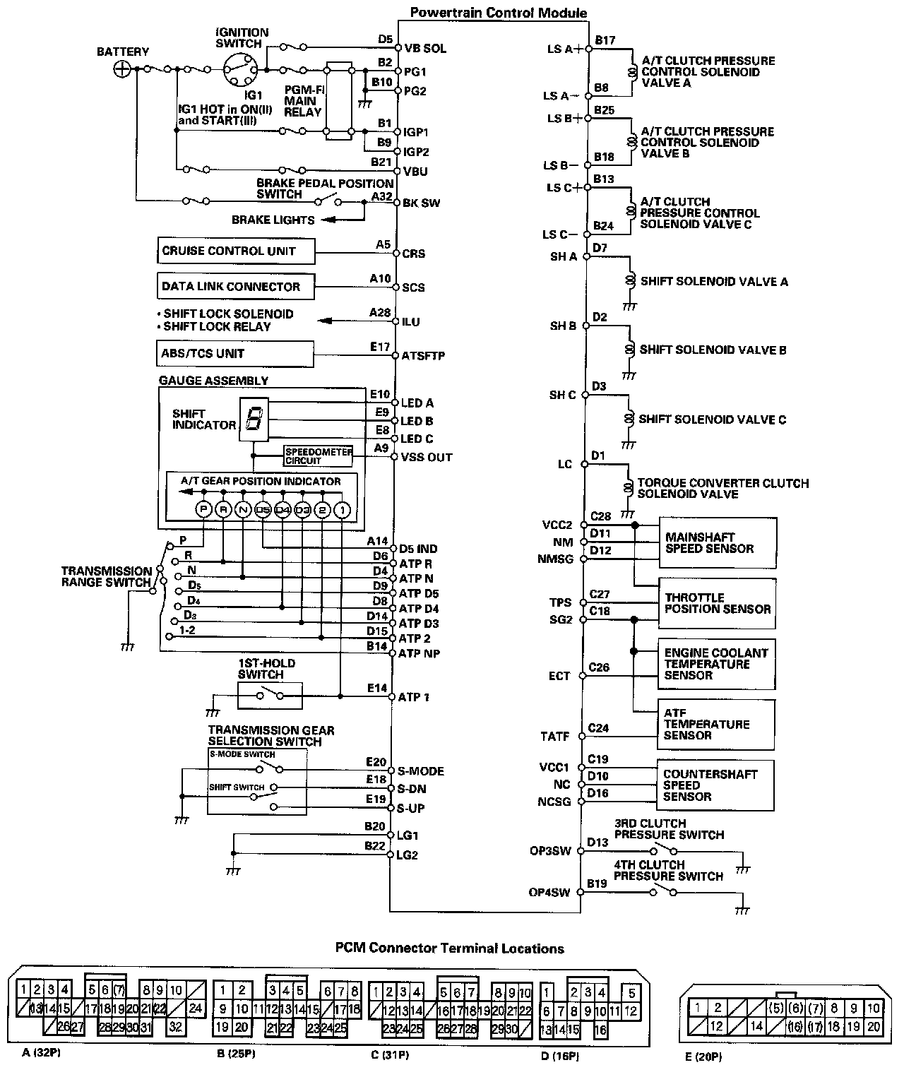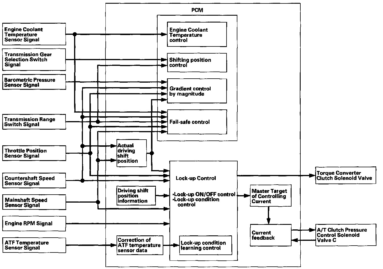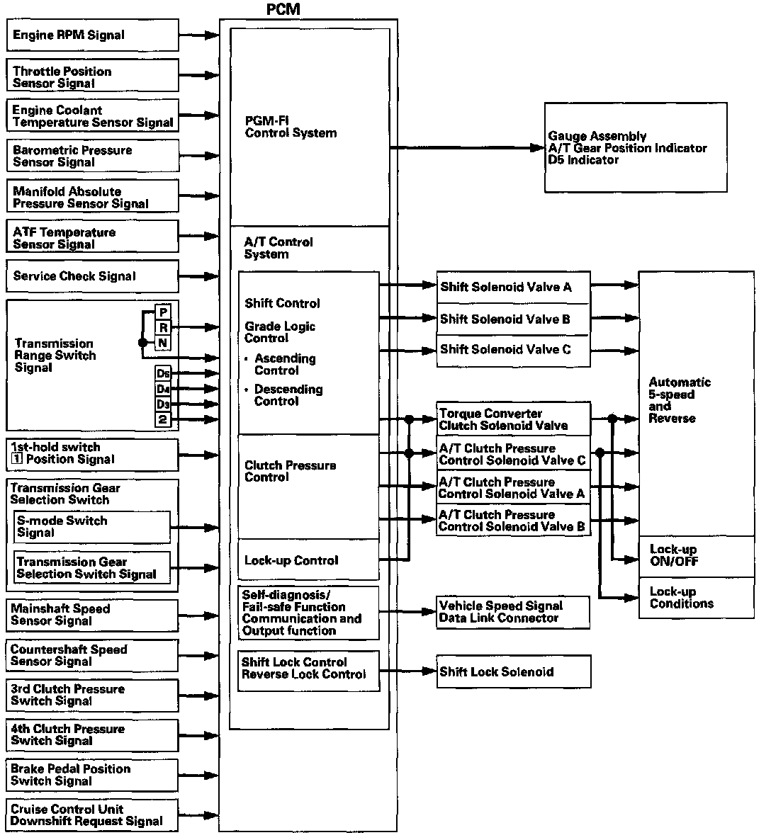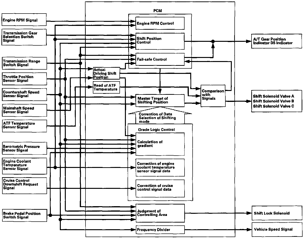 The PCM receives input signals from the sensors, switches, switches, and other control units, perform processing data, and outputs signals for the engine control system and A/T control system. The A/T control system includes shift control, grade logic control, clutch pressure control, and lock-up control is stored in the PCM. The PCM switches the shift solenoid valves and the A/T clutch pressure control solenoid valves to control shifting transmission gears and lock-up torque converter clutch.