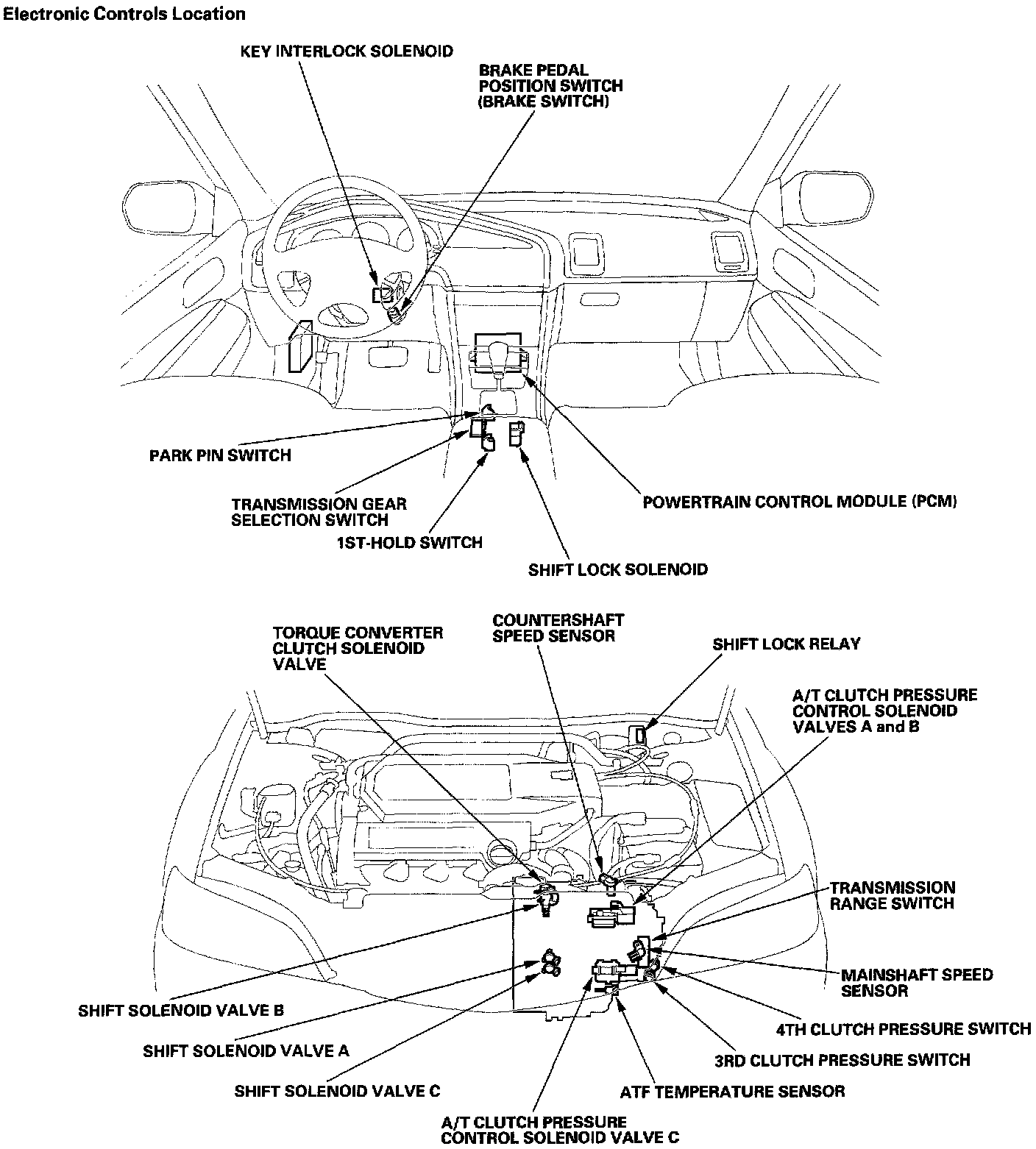Functional DiagramThe electronic control system consists of the Powertrain Control Module (PCM), sensors, and 7 solenoid valves. Shifting and lock-up are electronically controlled for comfortable driving under all conditions.