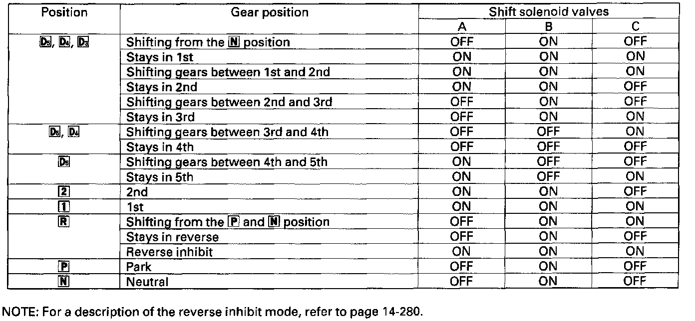 The PCM turns on the shift solenoid valves A, B, and C to control shifting transmission gear. The combination of driving signals to shift solenoid valves A, B, and C are shown in the table below.