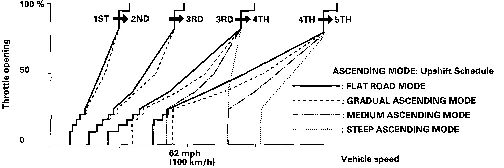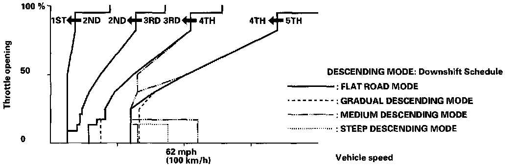 When the PCM determines that the vehicle is going down a hill in [D5], [D4] and [D3] positions and the sequential sportshift mode position, the shift-up speed from 4th to 5th gear, 3rd to 4th gear and from 2nd to 3rd (when the throttle is closed) becomes faster than the set speed for flat road driving to widen the 4th gear, 3rd gear and 2nd gear driving areas. This, in combination with engine braking from the deceleration lock-up, achieves smooth driving when the vehicle is descending. There are three descending modes with different 4th gear driving areas, 3rd gear driving areas and 2nd gear driving areas according to the magnitude of a gradient stored in the PCM. When the vehicle is in 5th gear or 4th gear, and you are decelerating when you are applying the brakes on a steep hill, the transmission will downshift to lower gear. When you accelerate, the transmission will then return to higher gear.