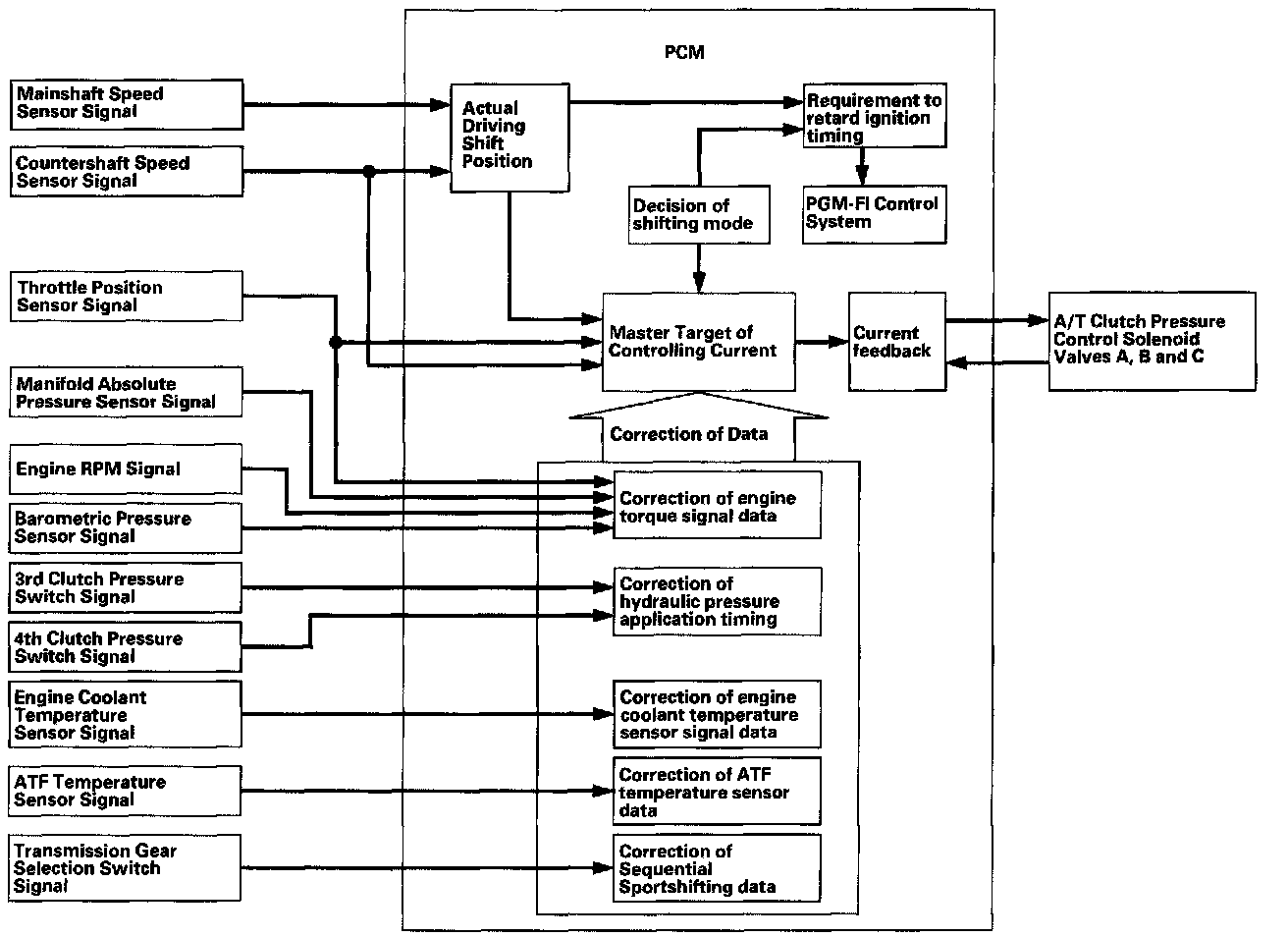 The PCM actuates the A/T clutch pressure control solenoid valves A, B, and C to control the clutch pressure. When shining between lower and higher gears, the clutch pressure regulated by the A/T clutch pressure control solenoid valves A, B, and C engages and disengages the clutch smoothly.
