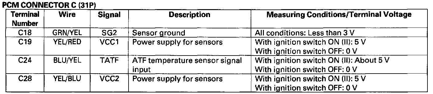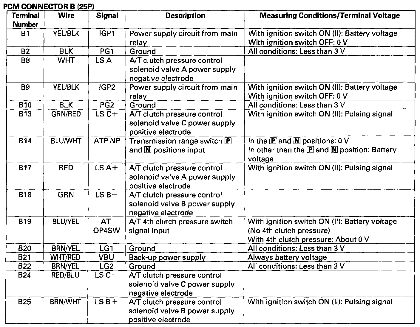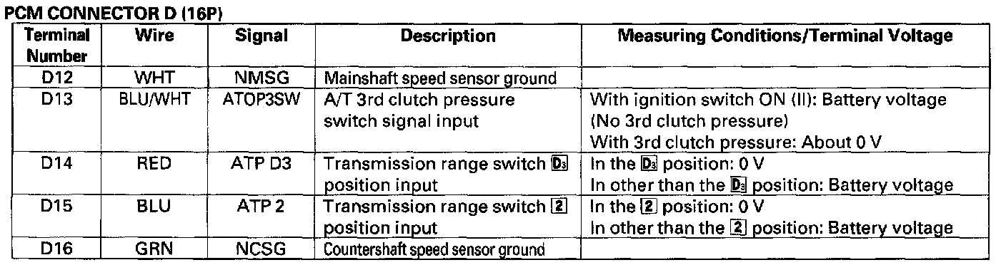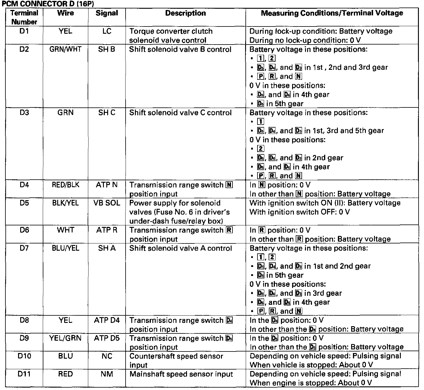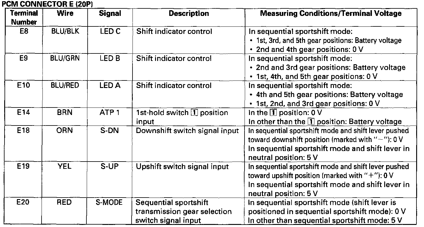 The PCM terminal voltage and measuring conditions for the A/T control system are shown. Other PCM terminal voltage and measuring conditions are described in section 11.