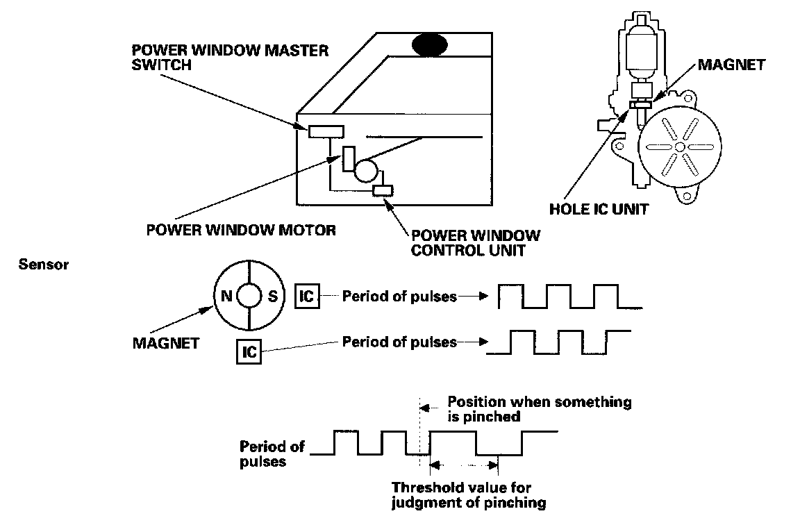 DescriptionsThe driver's window will stop and automatically open if you pinch your hand or something during auto-up operation. The system is composed of the power window master switch, the power window control unit and the driver's window motor.