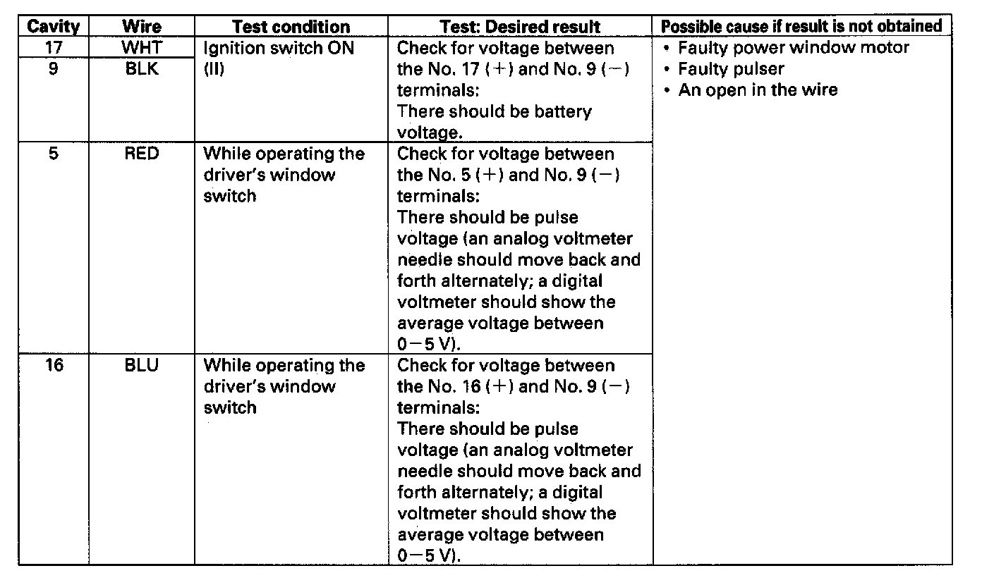 5. Reconnect the 18P connector to the power window control unit, and make these input tests at the connector.