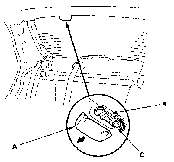 2. Remove the window antenna terminal cover (A) from the window antenna terminal base (B), and disconnect the window antenna connector (C).