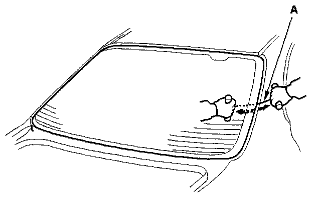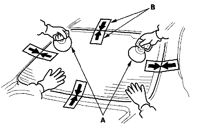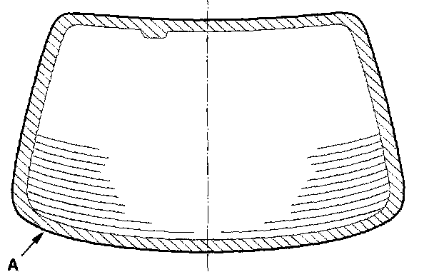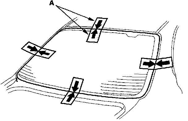 16. Set the rear window in the opening, and center it. Make alignment marks (A) across the rear window and body with a grease pencil at the four points shown. Be careful not to touch the rear window where adhesive will be applied.
