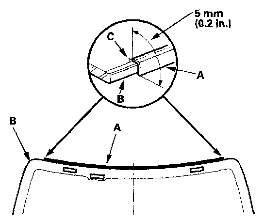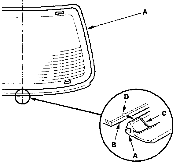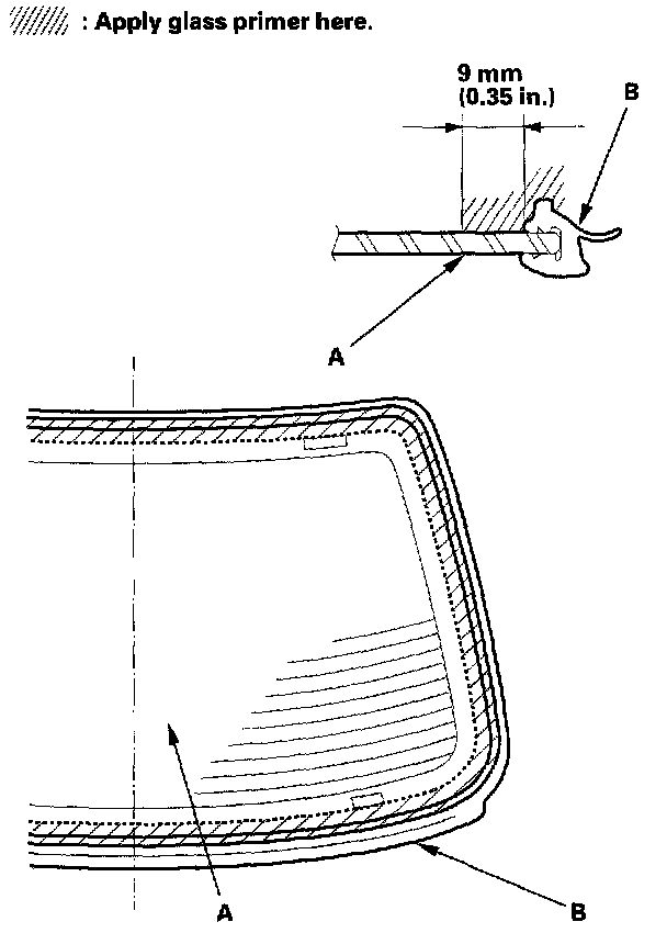 18. With a sponge, apply a light coat of glass primer along the edge of the rear window (A) and molding (B) as shown, then lightly wipe it off with gauze or cheesecloth: