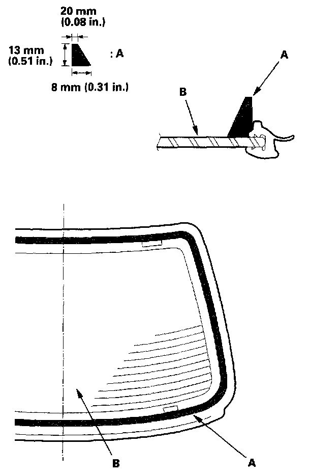 21. Pack adhesive into the cartridge without air pockets to ensure continuous delivery. Put the cartridge in a caulking gun, and run a bead of adhesive (A) around the edge of the rear window (B) as shown. Apply the adhesive within 30 minutes after applying the glass primer. Make a slightly thicker bead at each corner.