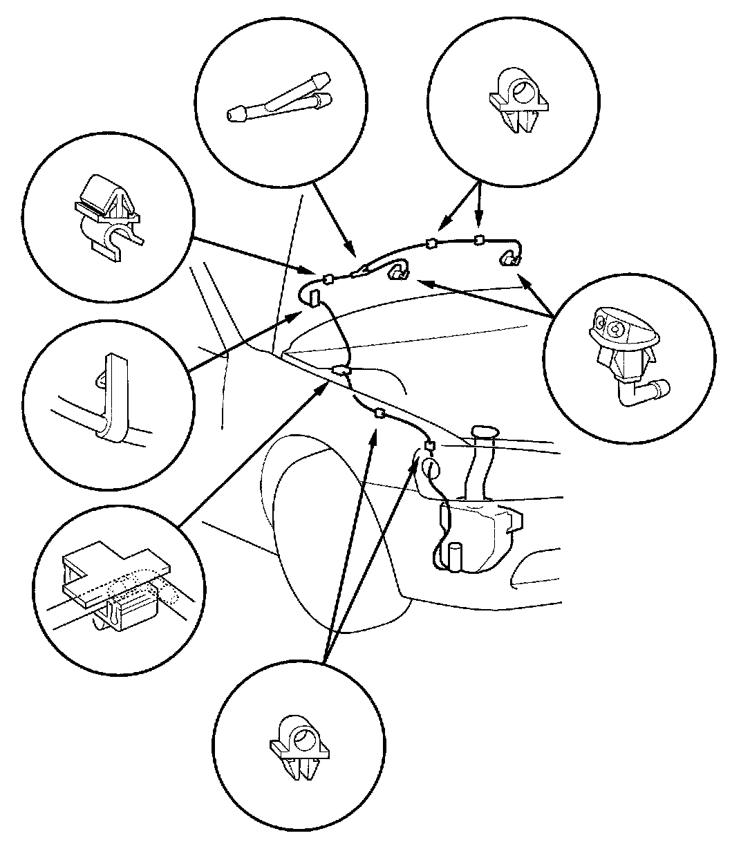 2. Remove the windshield washer nozzles and clips, then remove the tube.