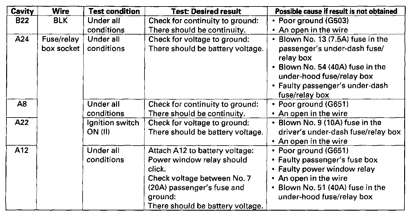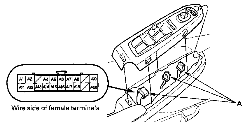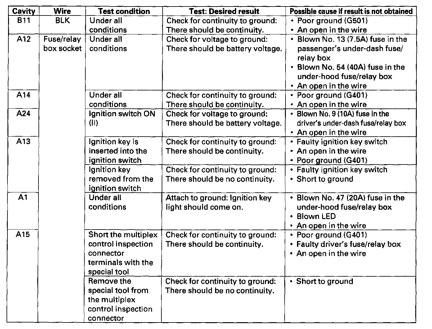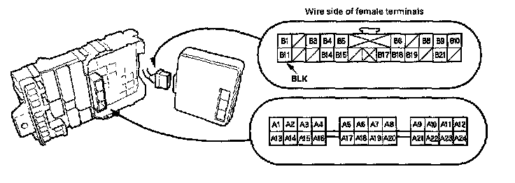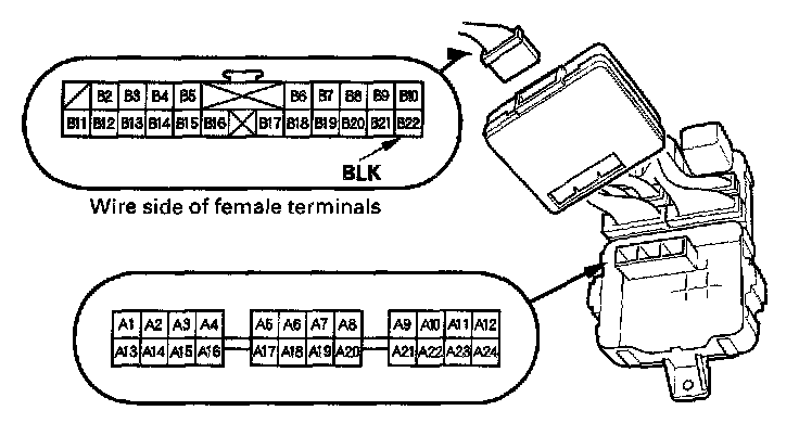 10. Make the following input tests at 22P connector B and the driver's under-dash fuse/relay box socket connector A. Be careful not to spread the fuse box connectors.