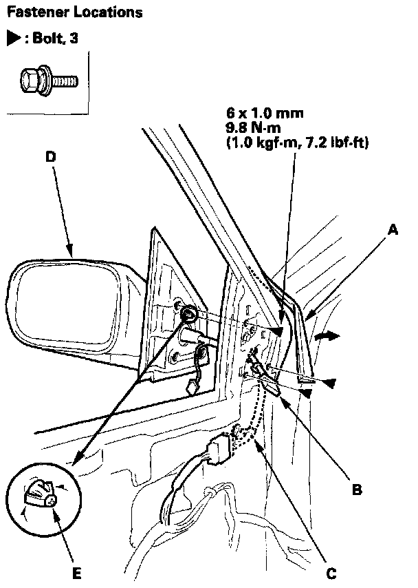 5. Pull the front door upper seal (A) as necessary, disconnect the connector (B), and detach the harness clip (C), then remove the bolts securing the mirror. While holding the mirror (D), push out the clip (E), and remove the mirror. Take care not to scratch the door.